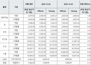 [표] LME 비철금속 및 환율 동향(12월 3일)