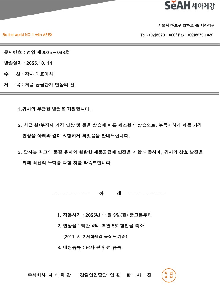 회사측에 따르면 최근 원부자재 가격 인상 및 환율 상승에 따른 제조원가 상승으로 부득이하게 제품 가격 인상을 시행하게 됐다고 밝혔다. 이에 11월 3일 출고분부터 백관 4%, 흑관 5% 할인율을 축소할 계획이다.