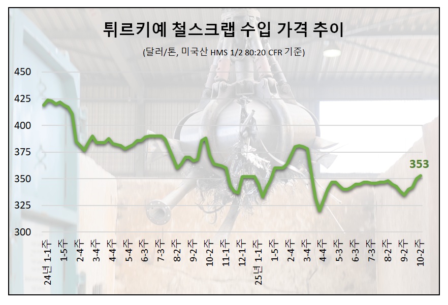 업계에 따르면 10월 셋째 주(15일) 튀르키예 철스크랩 수입 가격은 미국산 HMS(80:20) 기준 톤당 353달러(CFR)로 전주 대비 3달러 오르며 4주 연속 상승했다.