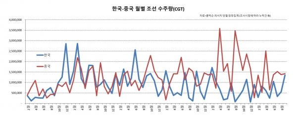 클락슨리서치에 따르면 9월 전 세계 신규 선박 발주량은 350만CGT(123척)로, 지난해 같은 달보다 44% 감소했다. 국가별로는 중국이 142만CGT(69척, 40%), 한국이 135만CGT(33척, 39%)를 각각 기록하며 양분했다. 척당 환산톤수는 한국이 4만1,000CGT로, 중국(2만1,000CGT)의 두 배를 웃돌았다.