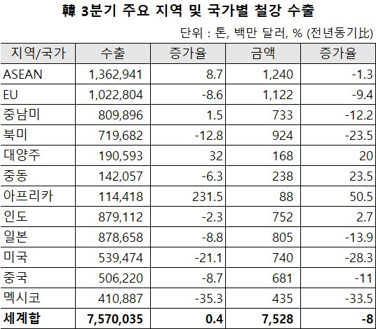 한국철강협회에 따르면, 올해 7~9월 한국의 철강 수출은 757만 톤으로, 지난해 같은 기간과 비교해 0.4% 증가했다. 수출액은 총 75억3천만 달러로, 전년동기대비 8% 줄었다.