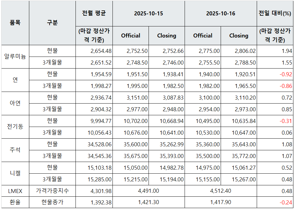 [표] LME 비철금속 및 환율 동향(10월 16일)