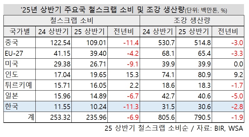 반면 철스크랩 최대 소비국인 중국은 올 상반기 조강 생산 감소와 함께 철스크랩 소비도 주요국 중 최대폭으로 감소했다.
