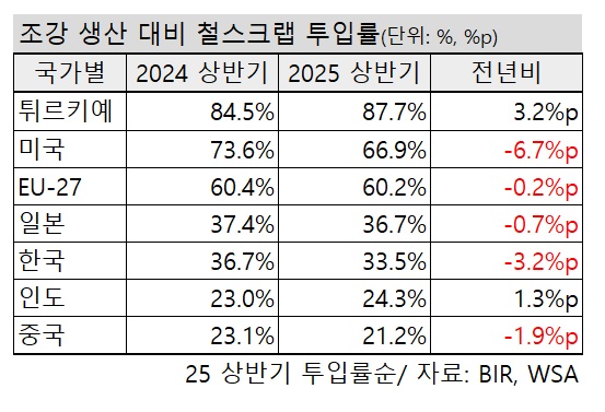 이어 국가·지역별로 올 상반기 조강 생산 대비 철스크랩 투입률은 △미국 66.9%(전년比 -6.7%p) △유럽연합 60.2%(-0.2%p) △일본 36.7%(-0.7%p) △한국 33.5%(-3.2%p) △인도 24.3%(+1.3%p) △중국 21.2%(-1.9%p) 등 순으로 집계됐다. 튀르키예와 인도를 제외하고 일제히 하락한 모습이다.