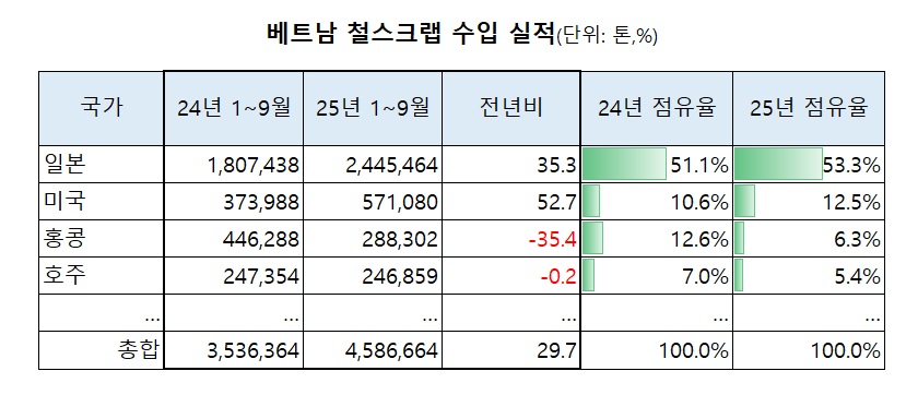 이에 따라 올 1~9월 베트남 철스크랩 수입은 458만7,000톤으로 전년 동기 대비 29.7% 급증한 것으로 나타났다. 앞서 1분기(+8.2%)와 상반기(+24.2%) 대비 증가폭은 더욱 확대되고 있는 모습이다.