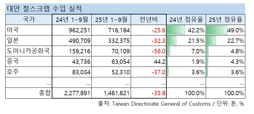한편, 대만 무역통계에 따르면 올 1~9월 대만 철스크랩 수입은 전년 동기 대비 35.8% 급감한 146만2,000톤으로 집계됐다.