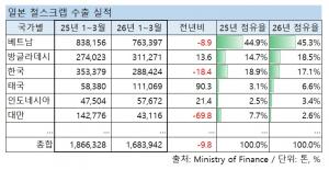 국가별 수입은 올 1~9월 미국산이 71만6,000톤으로 전년 동기 대비 25.6% 줄었으며, 이 기간 일본산 역시 32.3% 급감한 33만2,000톤을 기록했다.