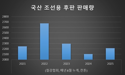 철강업계에 따르면 올해 1~8월 국산 조선용 후판 판매량은 약 2,21만2천 톤으로 전년 동기 2,10만3천 톤 대비 5.2% 늘었다. 2년 연속 감소세를 끊었지만, 2022년 고점 2,67만4천 톤 대비 여전히 17% 낮은 수준이다.
