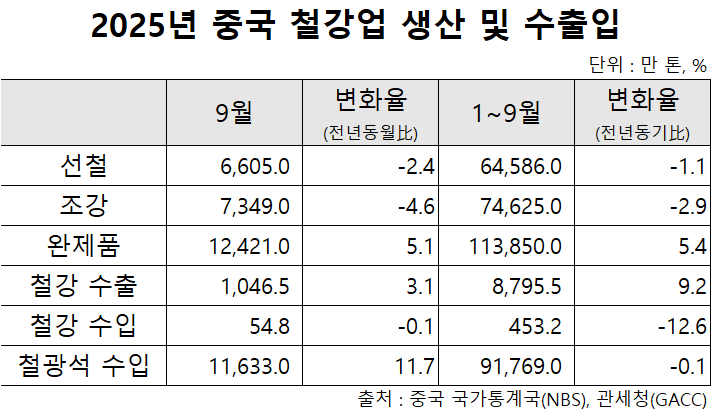 한편, 중국의 완제품(finished steel) 생산은 증가세를 이어갔다. 9월 생산은 1억2,421만 톤으로 지난해 동월 대비 5.1% 증가했다. 1~9월 누적 생산도 전년동기대비 5.4% 늘어 11억3,850만 톤을 기록했다.