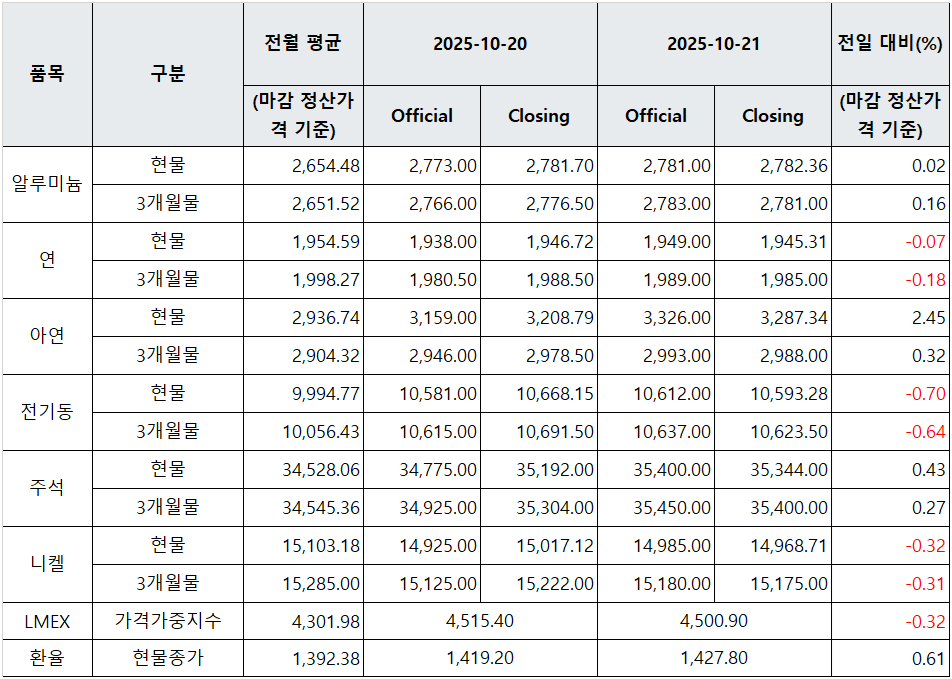 [표] LME 비철금속 및 환율 동향(10월 21일)