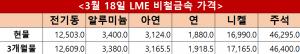 출처=KOMIS런던금속거래소(LME) 전기동 현물 및 3개월물 공식 가격이 21일(현지시간) 기준 톤당 각각 10,612달러, 10,637달러로 집계되며 미·중 무역 협상에 대한 기대감과 재고 감소세에 힘입어 상승세를 이어갔다.