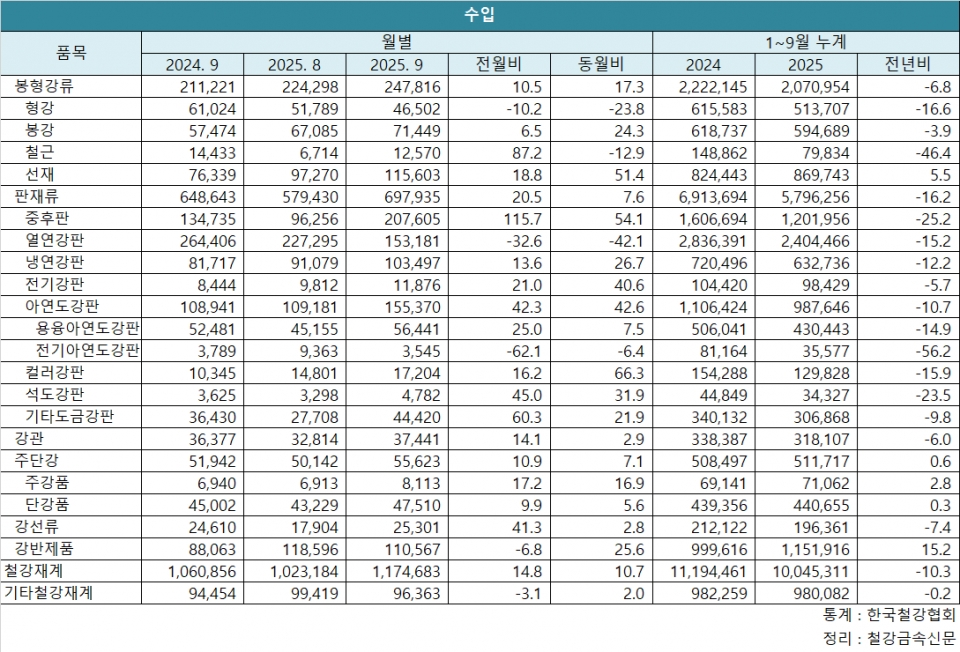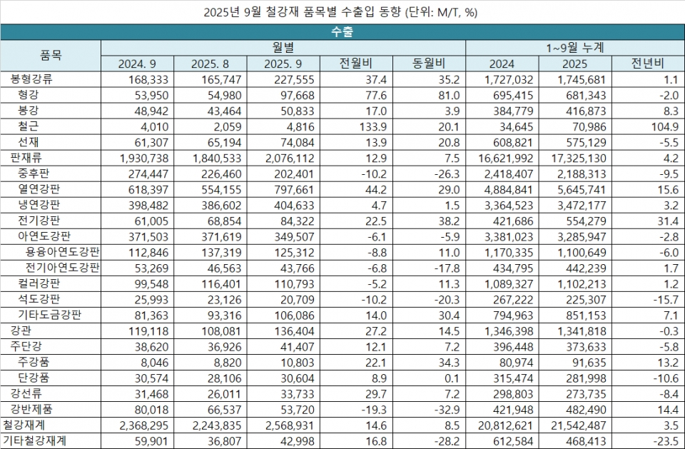 [표] 스테인리스강 열연광폭강대 2025년 9월 수출입