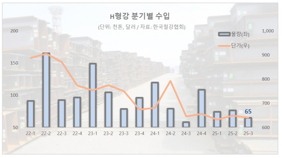 통상 국내 H형강 수입은 상반기 대비 하반기가 더 저조한 점을 고려하면 올해 추가 저점 갱신에도 무게가 실린다. 지난해 H형강 총수입 역시 2018년(36만4,000톤) 이후 6년 만에 최저치를 기록한 바 있다.