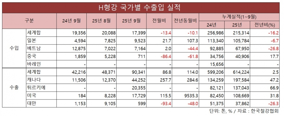 국가별 수입은 올 1~3분기 일본산 H형강 수입이 10만6,000톤으로 전년 동기 대비 6.7% 줄었으며, 특히 베트남산도 26.8% 급감한 6만8,000톤에 그쳤다.