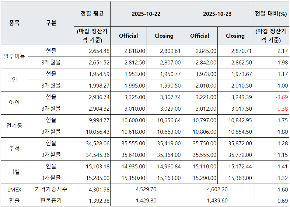 [표] LME 비철금속 및 환율 동향(10월 23일)