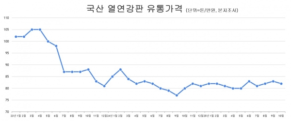국내 열연강판 가격은 좀처럼 움직이지 않고 있다. 본지가 집계한 자료에 따르면 10월 현재 유통가격은 톤당 82만 원 내외로, 지난해 10월과 사실상 같은 수준이다. 지난해 9월 77만 원까지 떨어진 이후 반덤핑 조사 개시와 예비판정의 영향으로 함께 소폭 반등했지만, 1년째 ‘박스권’에서 벗어나지 못하고 있다.