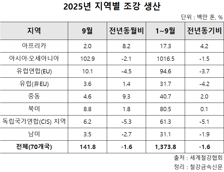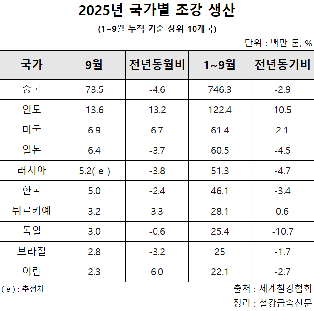‘韓·中·日 5개월 이상 감소’ 9월 글로벌 조강 생산 1.6%↓