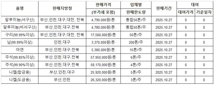 [표] 조달청 방출 가격(10월 27일)