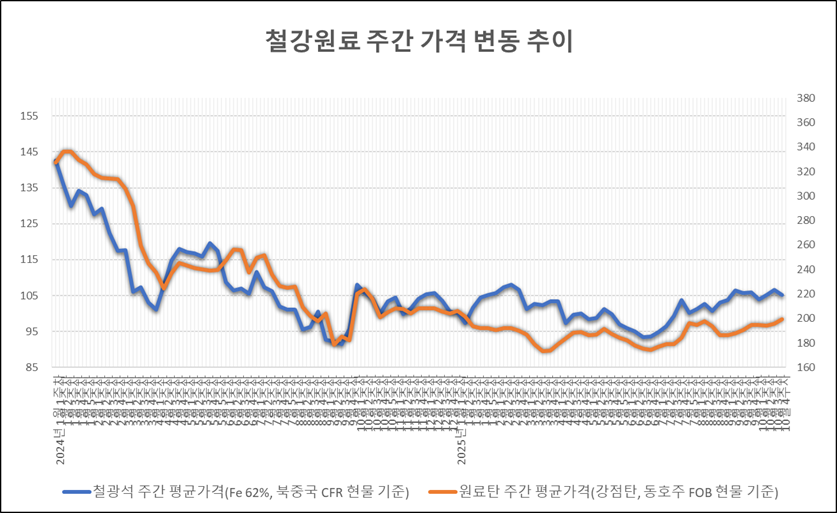 산업통상자원부 통계에 따르면, 철광석 가격(Fe 62%, 북중국 CFR 현물 기준)은 10월 넷째 주 평균 톤당 105.14달러로, 한 주 전보다 1.43달러 떨어졌다.