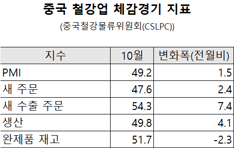 지난달 31일(현지시각) 중국철강물류위원회(CSLPC) 발표에 따르면, 10월 중국 철강 부문 구매관리자지수(Purchasing Managers’ Index, PMI)는 49.2로, 전월대비 1.5포인트(p) 올랐지만, 3개월 연속 기준선(50)을 밑돌았다. 지수가 기준선을 밑돌면 체감 경기 위축, 웃돌면 확장으로 해석한다.