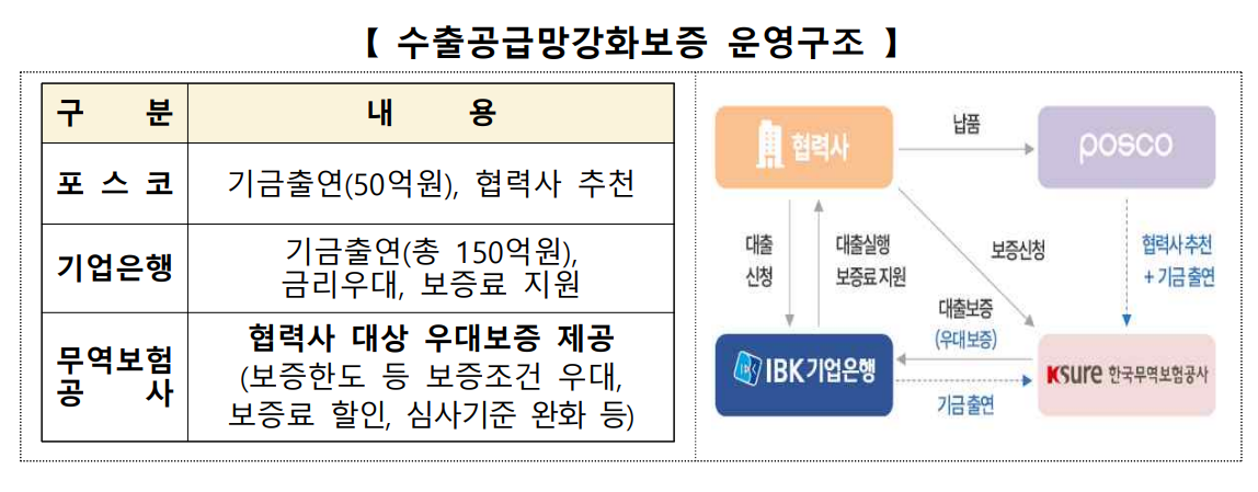 올해 내 출시될 수출공급망 강화보증 상품은 포스코 등 수출 대기업과 기업은행 등 시중 은행의 특별 출연을 토대로 협력사 제작자금 금리 우대와 보증 한도 확대 등 대-중소·중견 간 상생협력 지원이 담길 예정이다.