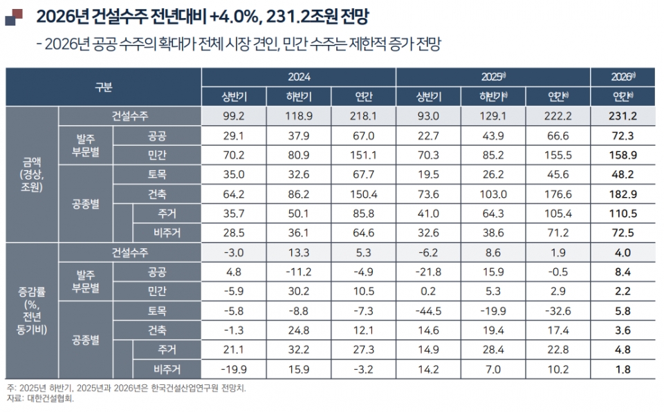 다만 민간 주택경기 회복 지연과 높은 공사비 부담, 정책·규제 강화, 경제 성장 둔화 등은 여전히 건설경기 회복에 발목을 잡고 있다는 평가다. 실제 내년도 건설수주도 민간부문 발주(+2.2%) 대비 공공(+8.4%)에서 큰 폭 증가할 것이란 예측이다.