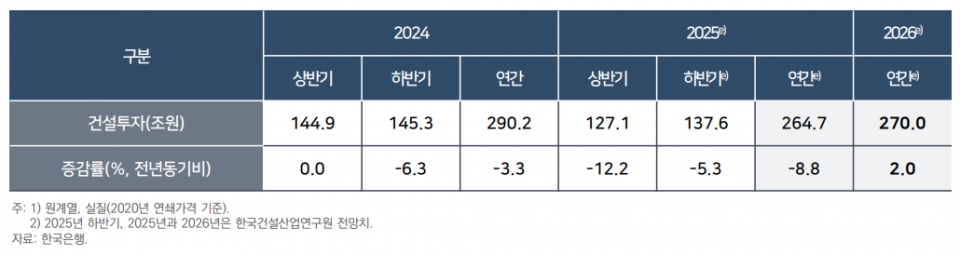 내년 건설투자 역시 착공 지연에 따른 부진이 이어지지만 공공 물량 증가와 함께 기저효과로 전년 대비 2.0% 늘어난 270조원으로 전망됐다.