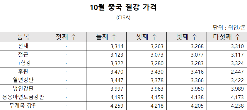 CISA, 10월 다섯째 주 철강 價 소폭↑