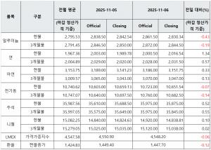 [표] LME 비철금속 및 환율 동향(11월 6일)