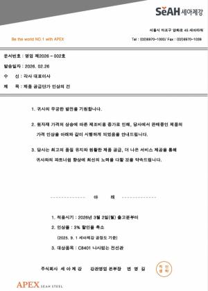 - ■ 세아제강, 나사 없는 전선관 가격 인상공문 발송