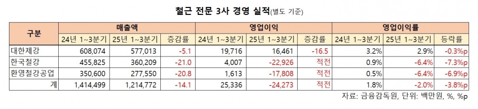 본지가 17일 금융감독원 자료를 통해 대한제강과 한국철강, 환영철강공업 등 철근 전문 제강 3사 경영실적을 집계한 결과, 올해 이들 1~3분기 매출액은 총 1조2,148억원으로 전년 동기 대비 14.1% 감소한 것으로 나타났다.