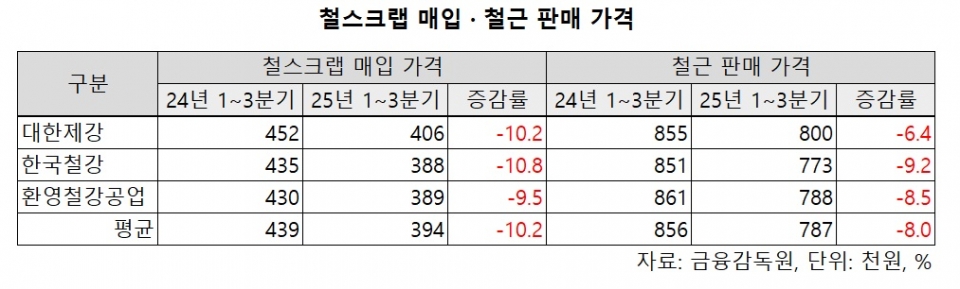 올 1~3분기 이들 3사 철근 판매 가격은 평균 톤당 78만7,000원으로 전년 동기 대비 8.0% 하락했으며, 주원료인 철스크랩 매입 단가 역시 10.2% 내린 39만4,000원으로 집계됐다.