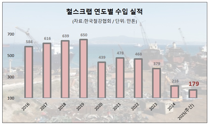 가동률 저하에 제강사들이 국내 구입도 축소하면서 2022년 28만톤을 저점으로 2023년(36만톤), 지난해(39만톤)에 이어 3년 연속 확장세다.