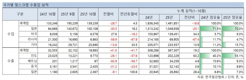 올 1~10월 철스크랩 수출은 전년 동기 대비 19.2% 늘어난 36만7,000톤으로 집계됐다. 월평균 수출은 3만7,000톤 수준으로 올해 총수출은 44만톤으로 추산된다.