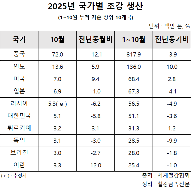 한국과 일본의 조강 생산도 각각 510만, 690만 톤으로 지난해 10월 대비 5.8%, 1% 감소했고, 7개월 연속 2024년보다 낮은 수준을 기록했다.