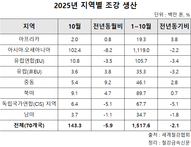세계철강협회(WSA) 통계에 따르면, 지난달 전 세계 70개국의 조강 생산은 1억4,330만 톤으로, 2024년 같은 달과 비교해 5.9% 줄었다. 1~10월 누적 생산도 지난해 같은 기간 대비 2.1% 감소해 15억1,760만 톤을 기록했다.