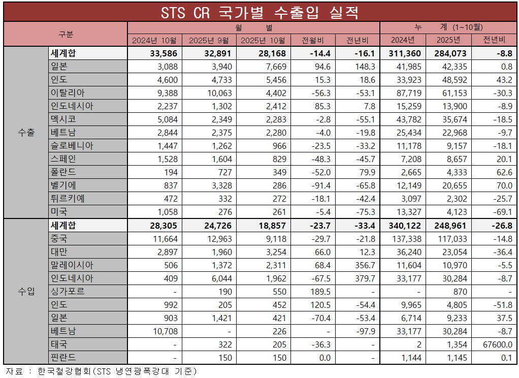 [표] 스테인리스강 열연광폭강대 2025년 10월 수출입