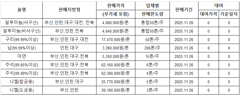 - ■ [표] 조달청 방출 가격(11월 19일)