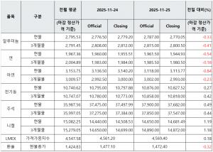 [표] LME 비철금속 및 환율 동향(11월 25일)
