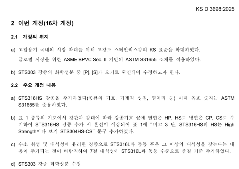 특히 ‘STS316HS’ 강종을 추가하며 유효 숫자를 ASTMS31655로 준용한다는 내용과 강판 및 강대에 따라 기호 끝에 열연은 HP 또는 HS로 표기하여 최근 추가된 STS316HS강에서 ‘HS’가 실제 뜻인 High Strength(고장력)과 열연표시인 HP와 혼선될 우려가 있어 비고란에 이 같은 구분을 명확히 하는 문구를 추가했다. 이에 열연은 STS316HS-HS 냉연은 STS316HS-CS 등으로 표기하기로 했다.