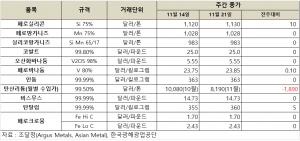 [표] 희유금속 가격 동향(11월 21일)