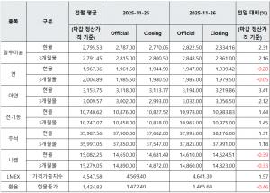 [표] LME 비철금속 및 환율 동향(11월 26일)