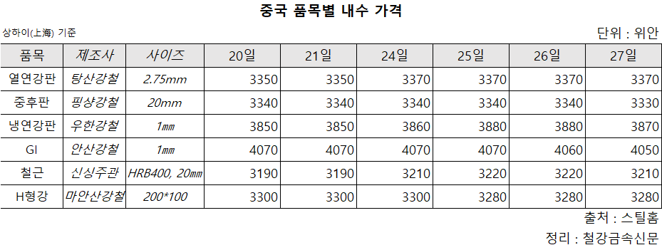 27일(현지시각) 스틸홈 일일 중국 철강 가격 통계에 따르면, 품목별 일주일 전 대비 가격 증감 방향은 엇갈렸지만, 그 수준은 모두 1% 미만에 그쳤다. 열연강판, 냉연강판, 철근 가격이 각각 톤당 20위안 올랐고, 용융아연도금강판과 H형강 가격은 20위안 떨어졌다. 중후판은 톤당 10위안의 가격 낙폭을 보였다.