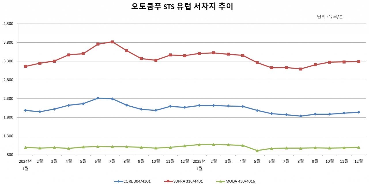 400계에선 3사 모두 STS430 강종을 소폭 인상하며 올해 내내 강세를 띄고 있는 크로뮴 가격 반영을 연말까지 이어갔다. 12월 STS430(MODA 4016) 할증료는 오토쿰푸가 톤당 1,003유로, 아세리녹스가 3,170유로, 아페람이 톤당 969유로로 각각 전월 대비 16유로, 12유로, 22유로 인상됐다.