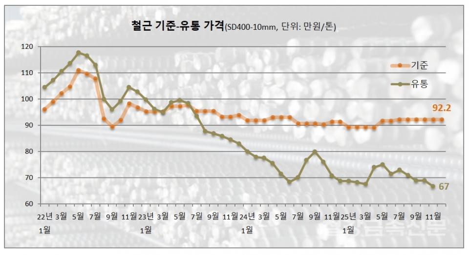 업계에 따르면 12월 철근 기준가격(SD400, 10mm)은 건설향 톤당 92만2,000원으로 전월 대비 동결됐다.