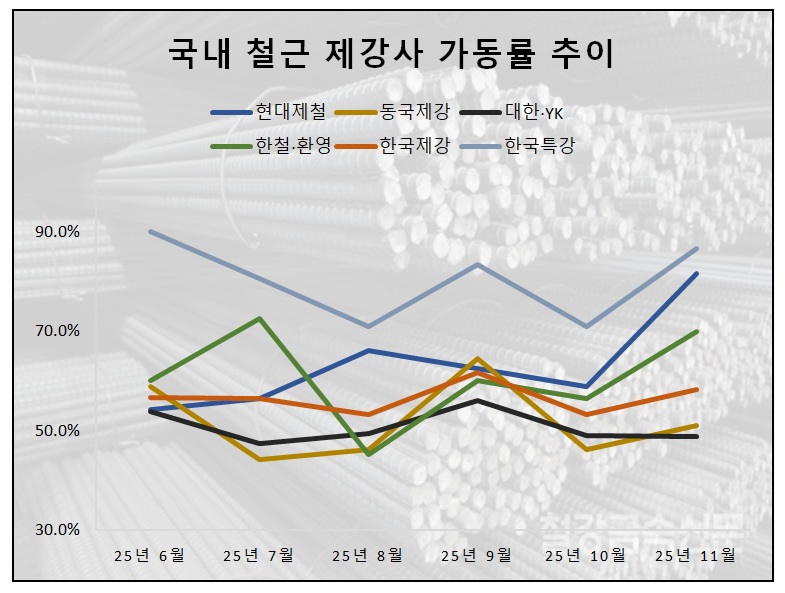 업계에서는 지난달에 이어 현대제철의 높은 철근 가동률 여부에 주목하고 있다. 실제 현대제철의 생산일정을 살펴보면 11월 회사 철근 가동률은 포항을 제외한 인천, 당진공장에서 평균 90%에 달했다. 사실상 풀가동 체제를 유지한 셈이다.