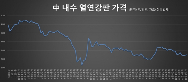 철강업계에 따르면 11월 4주 중국 열연 내수 가격은 톤당 3,297위안으로 전주 대비 8위안 상승했다. 가격은 9월 중순 이후 3,200~3,300위안 구간에서 3개월 가까이 박스권 횡보 흐름을 유지하고 있다.