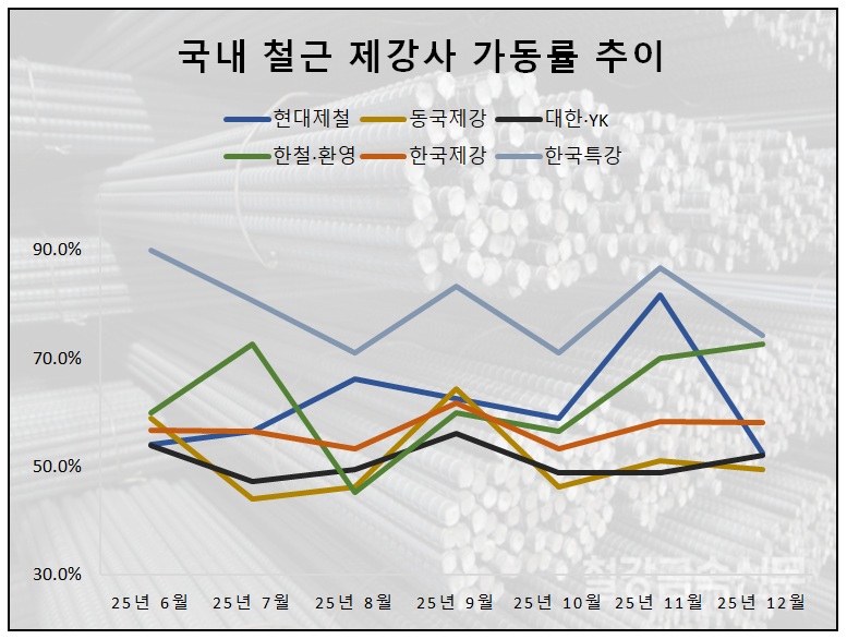 12월 철근 가동률 60%대 지속…현대제철 대보수·비가동 '뚝'