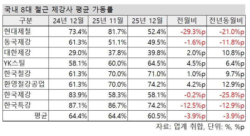 이어 제강사별로 낮은 가동률은 △동국제강(49.5%) △현대제철(52.4%) △한국제강(58.1%) 등 순으로 집계됐다.