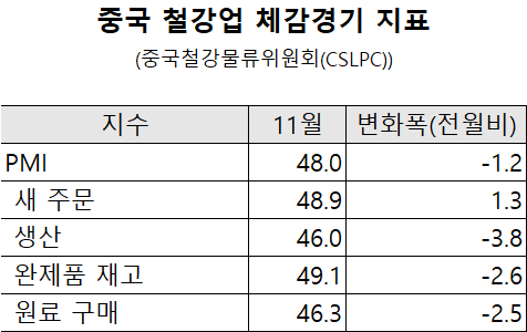‘비수기 속 체감경기 악화’ 中 11월 철강업 PMI 48